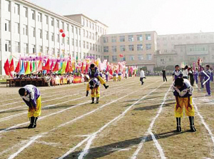 陣擺長龍跑馬城。“分兵遣將選良才,陣擺長龍對面排。正欲齊心奪勝券,格格送信出城來。”這首詩描寫的是滿族兒童春季玩的一種游戲——“跑馬城”。玩這種游戲時,孩子們分成人數(shù)相同的兩隊橫列,面向而站。玩時,甲隊先誦兒歌一句,乙隊接下句,一遞一句:“機機靈,跑馬場,馬城開,打發(fā)格格送信來!”“你要誰?我要某某某!”被點到名字的兒童立刻向?qū)Ψ經(jīng)_去,對方陣營則手臂相連形成一道防線,沖撞者如果沖破對方的防線,就從對方陣營中挑選一人帶回自己的隊伍;如果沒有沖破對方的防線,沖撞者就被對方俘虜了。然后雙方再進行下一輪“對話”和“沖營”。游戲結(jié)束時,以剩下人數(shù)多的一方為勝方。這種游戲最適合男孩玩,他們往往玩得滿頭大汗,樂此不疲!