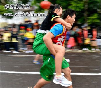 在昌江黎族自治縣一帶流行。每年的農(nóng)歷十五前后,孩子們就聚居在一空曠地,舉行村與村之間比賽??筛鶕?jù)人數(shù)來分組,每組2人(一男一女),每次由兩組進(jìn)行,實(shí)行淘汰制,男背著女或女背著男亦可,與對方互相碰撞,男女通過踢、拉、推等動(dòng)作,千方百計(jì)地把對方背著的人或拉下,或把兩人分開,或倒地。在場觀看的人興高采烈,笑聲不斷,其樂無窮。