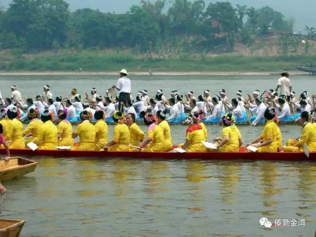 每年的潑水節(jié),西雙版納傣族都要舉行橫渡瀾滄江的賽龍舟活動。一般在潑水節(jié)的第一天舉行。比賽時,江上停泊著披綠掛彩的龍船,船上坐著數(shù)十名精壯的水手,船中間站立1人擊鑼指揮,號令一響,整裝待發(fā)的龍船像箭一般往前飛去,在規(guī)定的范圍內(nèi),哪一隊先到達(dá)目的地為勝。