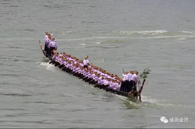此外,最耀眼的還是女子龍舟隊。她們的龍舟比男隊的更華麗,船身涂黃色的龍鱗,龍頭上伸出兩對長而彎曲的象牙,栩栩如生。