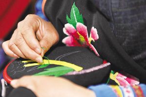北川羌繡色彩艷麗明快,構(gòu)圖嚴(yán)謹(jǐn)大膽,體現(xiàn)出千年羌族文化的沉淀。 新華社記者 陳凱攝