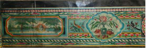 達(dá)拉特旗地區(qū)的墻圍畫高度一般在70厘米左右,其長度則依炕的大小而定??簧喜糠值漠嬍侵黧w,在結(jié)構(gòu)上有一套固定的模式,即以上下兩組邊道,按照一定的規(guī)格布置形成主體框架,中間等距離安排各種畫空,既具完整對稱的裝飾形式美感,又具簡繁對比、主從相映的豐富表現(xiàn)內(nèi)涵。邊道圖案種類繁多,有折子邊、卷帶邊、竹筒邊、花邊等。畫空也稱“池子”,有正方形、長方形、扇形、圓形等多種形式。此外,在下邊道與炕距離25-30厘米的范圍內(nèi)是黃顏色的邊子,這樣的設(shè)計是避免炕上物件的遮擋和抬高人的視線,便于觀賞。