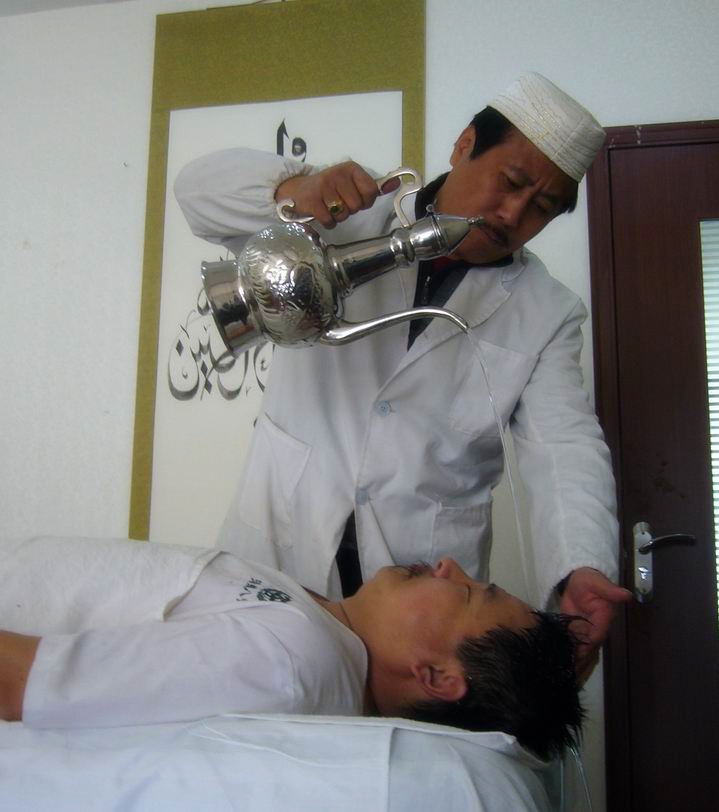 湯瓶八診療法,包括頭診、耳診、面診、手診、腳診、骨診、脈診、氣診八種療法,與現(xiàn)代經(jīng)絡(luò)學(xué)有相同的哲學(xué)思想。因人而異,運(yùn)用不同的經(jīng)脈、竅穴診療。它主要是依據(jù)回族醫(yī)學(xué)基本理論,運(yùn)用湯瓶水浴、末稍經(jīng)絡(luò)根傳法、放血、刮痧、火罐等湯瓶的基本手法,并結(jié)合穆斯林視為神圣的“杜阿伊”,分別作用于受施者身體的不同部位,操作者通過受施者的各種反應(yīng),即可判斷疾病之所在,進(jìn)而調(diào)整施術(shù)的治療手法、輕重程度和次序頻率等,從而使受施者達(dá)到提高免疫機(jī)能、防病治病的目的。