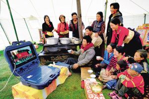 四川省甘孜州甘孜縣卡龍鄉(xiāng)卡龍村的牧民們高興地在新型帳篷中通過移動電視收看節(jié)目。尹鋼攝