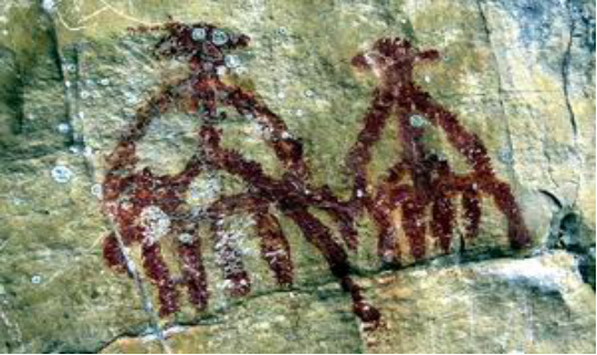 值得一提的是巖畫中的個體人物幾乎人人頭頂都有一支羽毛狀的頭飾,背上掛有披肩,類似今天的苗族傳統(tǒng)服飾,其中的頭飾藝術(shù)使得這里的巖畫充滿了躍動的生命感。巖畫色彩是純一色的紅色,視覺沖擊力極強,這里的巖畫圖像都充滿著愉快的生活氣息,呈現(xiàn)出一股浪漫主義的藝術(shù)風(fēng)格。這些巖畫表現(xiàn)出強烈的寫實風(fēng)格和民族風(fēng)格,生動、形象地記載、反映了當(dāng)時人民的生活狀況、生產(chǎn)力水平和宗教信仰等,整個巖畫群完全如同一部記載民族風(fēng)情的史書,反映了遠(yuǎn)古先民進(jìn)入貴州、拓土興邦的歷史,是填補貴州歷史空白的重要史料。