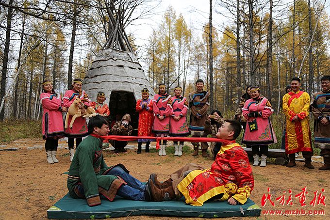 鄂倫春族傳統(tǒng)民俗文化帶動了鄉(xiāng)村旅游發(fā)展。圖為鄂倫春族傳統(tǒng)婚俗表演。