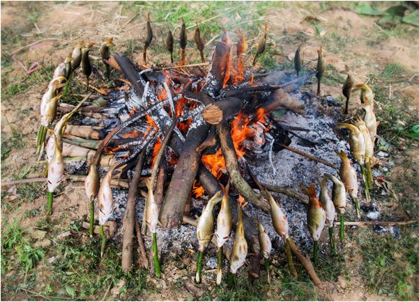 說起燒魚,得從古代人類祖先燒肉燒魚談起。苗族先輩們在長期的遷徙跋涉中,或到西南方向的崇山峻嶺定居后,都要到山下水塘、溪流中捕捉蛙魚來充饑,維持生活。由于沒有鍋頭和碗具,只能燃燒篝火紅炭來燒烤蛙、魚至熟,然后上山采摘蕉葉、芒草來墊盛,大家圍攏在一起一同享用,久而久之便形成了野炊燒魚的習慣,一直流傳至今。