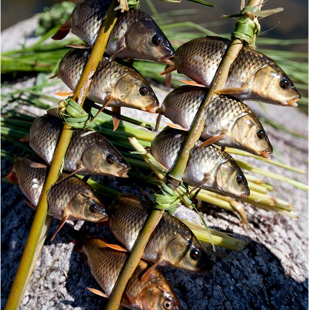 燒魚(yú)是廣西融水苗胞的習(xí)俗之一,融水的苗族同胞素有在稻田里養(yǎng)魚(yú)的習(xí)慣,每年春插,苗家人向來(lái)喜歡在稻田里放養(yǎng)鯉魚(yú)。每年的秋收稻黃時(shí)節(jié)也是田鯉肥壯之時(shí),這時(shí)來(lái)自四鄉(xiāng)八寨眾多的各民族兄弟便匯聚起來(lái),點(diǎn)燃一堆堆篝火,燒田鯉吃野餐,盡享豐收喜悅。燒魚(yú)從9月稻黃收割開(kāi)始持續(xù)到12月底才正式結(jié)束,故名“元寶山金秋燒魚(yú)季”。燒魚(yú)季節(jié),苗寨家家戶(hù)戶(hù)釀起醇濃的甜酒,蒸著香噴噴的糯米飯,帶上食鹽、辣椒、蒜苗、蔥花、薄荷等佐料上山去剪禾。晌午時(shí)候,他們?cè)谔镱^或田邊的平地?zé)鹨欢讯洋艋?,從田里抓?lái)一籠籠活蹦亂跳的鯉魚(yú),用樹(shù)枝或竹片把魚(yú)一條條串起,排成一排,然后放在紅彤彤的火炭上翻來(lái)覆去地烤,大約半小時(shí)左右,魚(yú)被烤炙得“呲呲”作響,水分烤干,慢慢地變黃,直至熟透,香飄四溢,遠(yuǎn)遠(yuǎn)就可聞到香味。