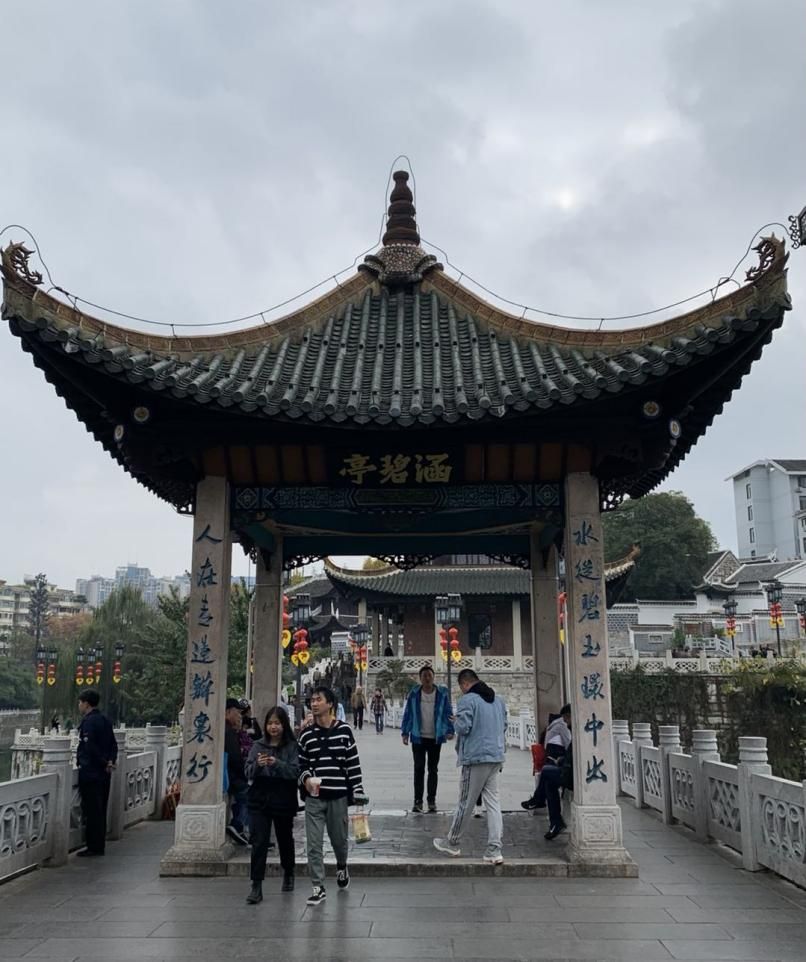 第一部分是石牌坊、浮玉橋和涵碧亭。漢白玉石牌坊上書“城南勝跡”四個(gè)大字,立柱的“抱鼓石”為八尊石獅子,石獅尾朝上頭朝下,活靈活現(xiàn),富有生氣。穿過石牌坊走上浮玉橋,橋體連接南北兩岸,其名來源于其質(zhì)地,由貴州特產(chǎn)白棉石打造,從遠(yuǎn)處看猶如一條玉帶浮在水面。橋上的涵碧亭是古人納涼休息的地方,因橋下有深潭“涵碧潭”而得名,亭子四柱上刻有兩幅對聯(lián),分別是“水從碧玉環(huán)中出,人在青蓮瓣里行”、“銀漢浮空星過水,玉虹拖雨雁橫秋”。