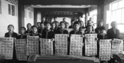 新疆阿克蘇地區(qū)烏什縣依麻木鎮(zhèn)國(guó)家通用語(yǔ)言學(xué)校的學(xué)生們?cè)谡故居补P書法作品。烏什縣委宣傳部供圖