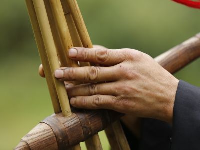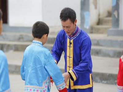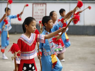 貴州貴陽苗族長竹舞傳承人教孩...