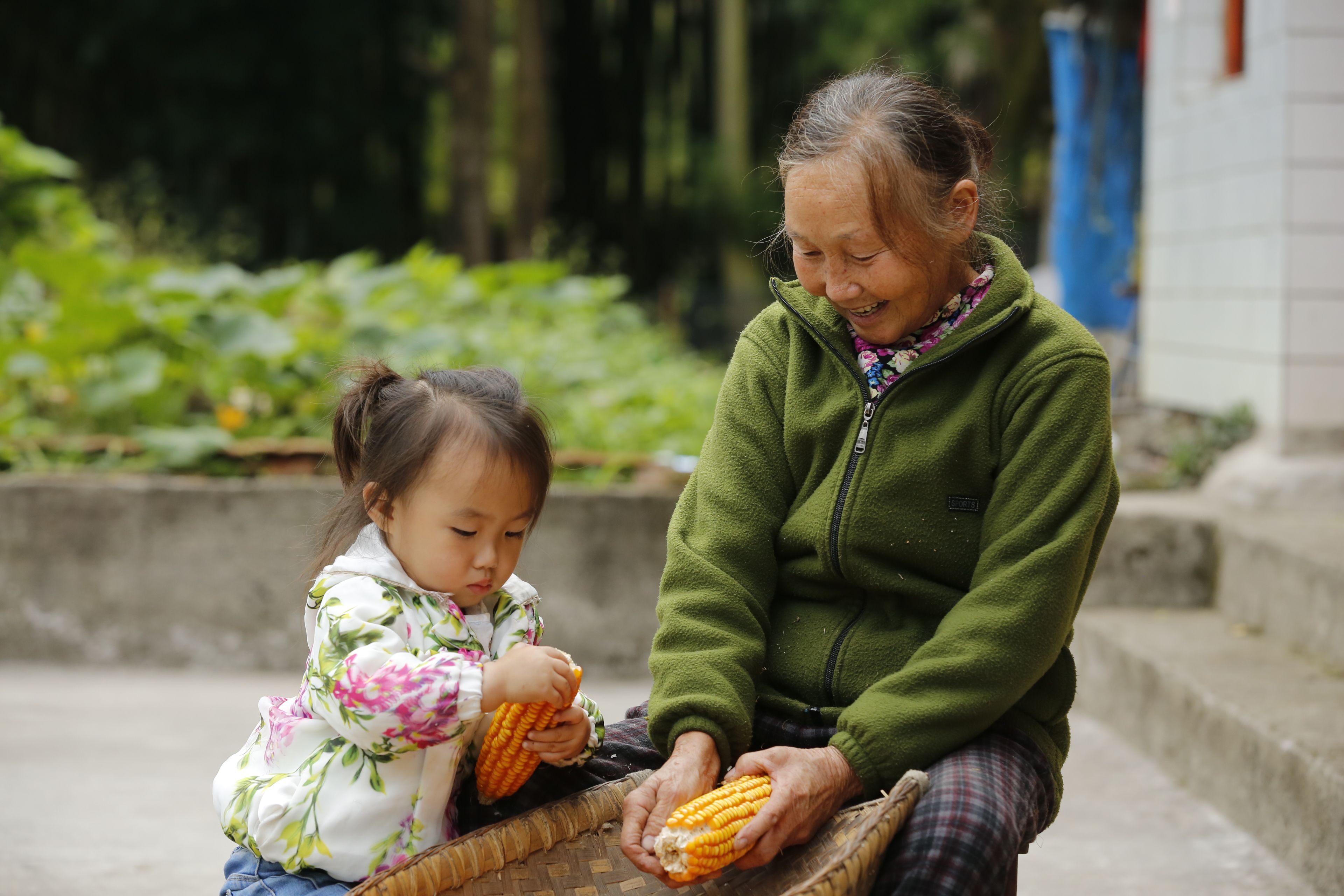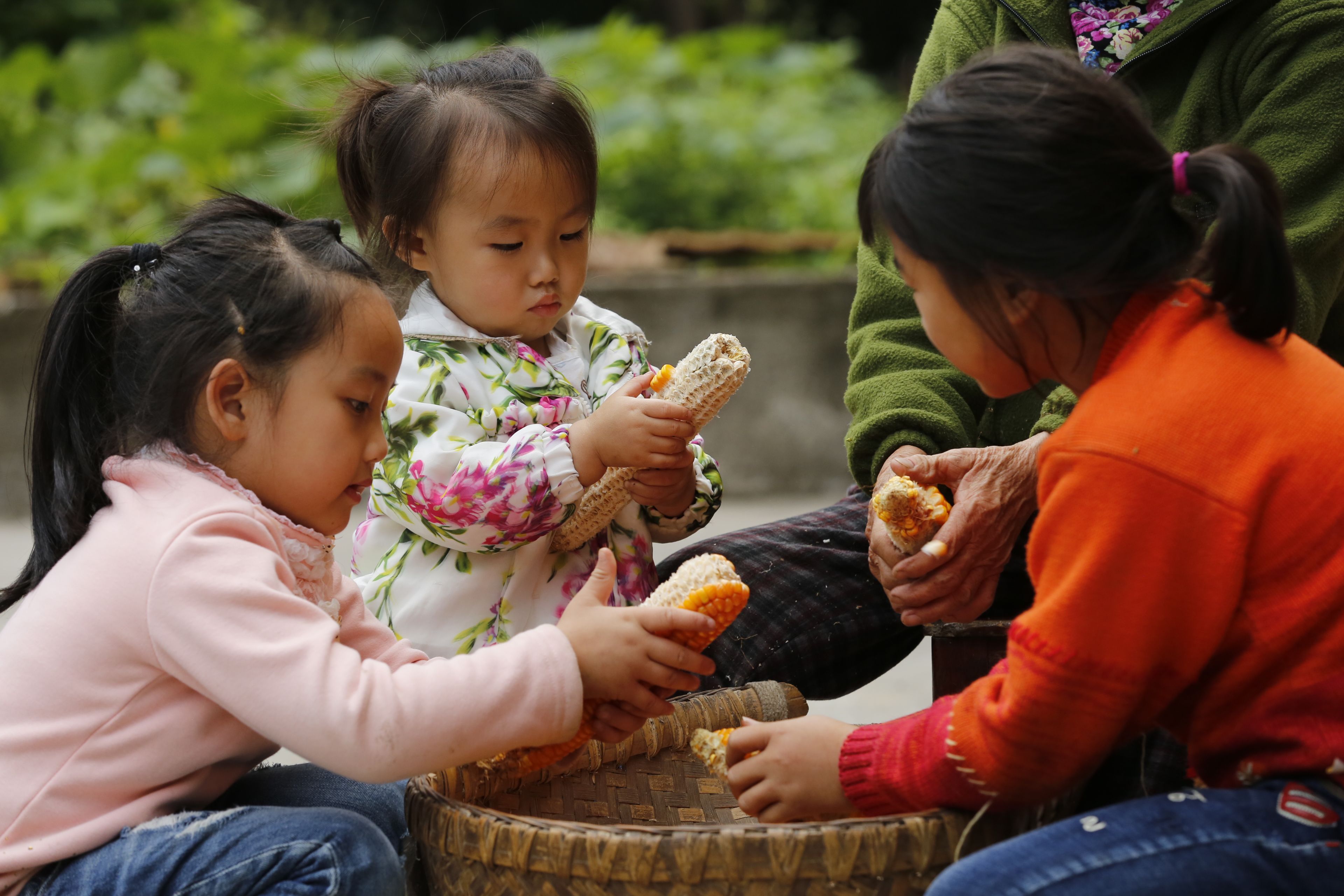 圖片說明:貴州貴陽苗族日常生活-老年人與兒童剝玉米